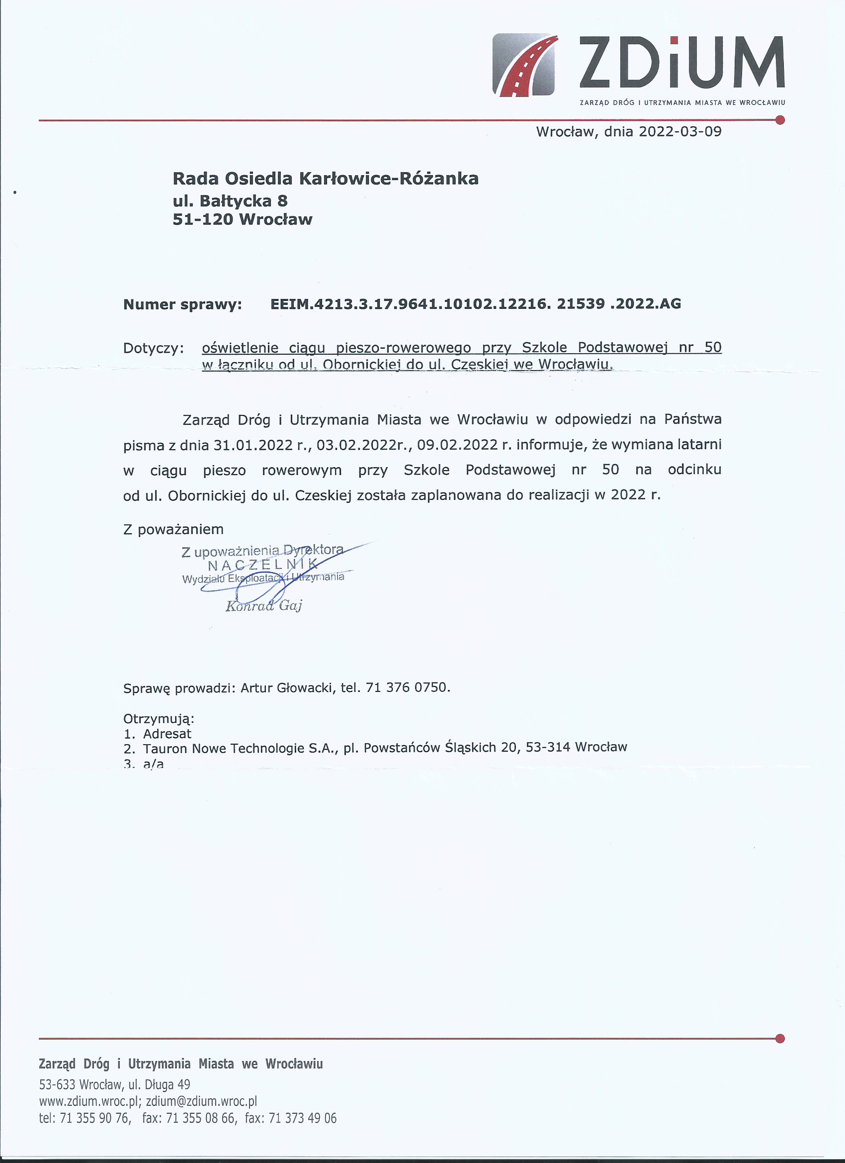 Pismo w sprawie budżetu Miasta na 2022 rok na działalność Osiedla.