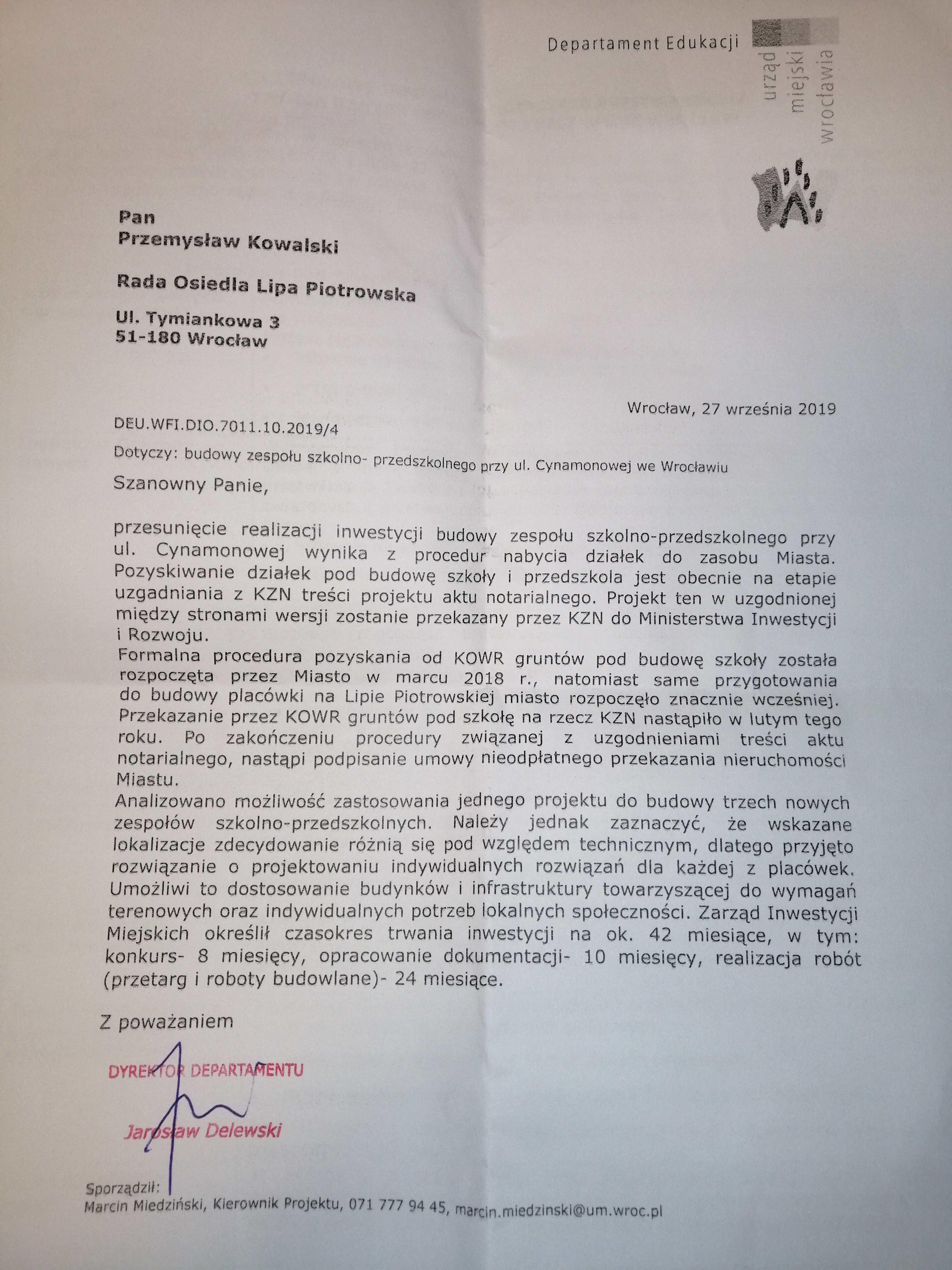 27.12.2018 - Parking przy stacji Wrocław Osobowice - odpowiedź DIiG