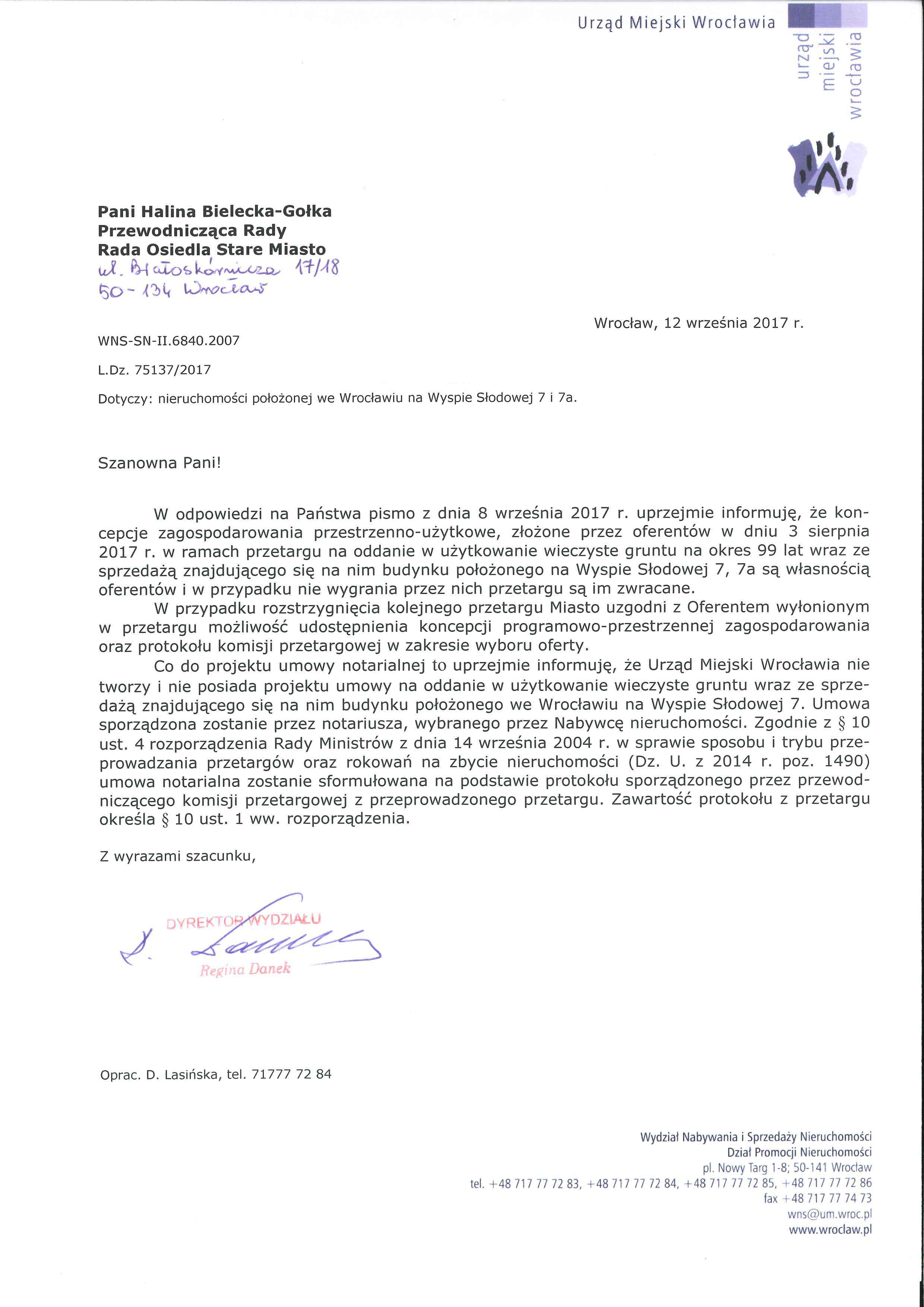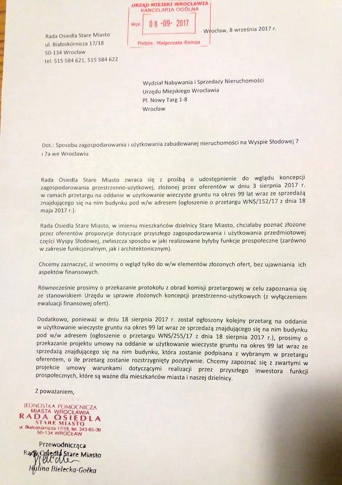 Pismo z dnia 4.10.2017 roku dotyczące sposobu zagospodarowania i użytkowania zabudowanej nieruchomości na wyspie Słodowej 7 i 7a we Wrocławiu